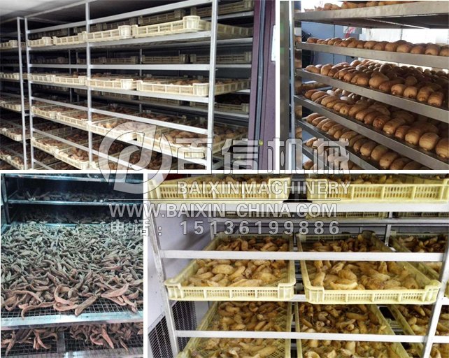 該項目位于貴州大方縣,為天麻烘干,烘干的形態為球莖狀(即:塊狀),物料的除含水:70-80%,產品的終含水:<10%,水分存在形式包括自由水分(可流動水)及毛細管水分,結合水,其他特性為粘性、熱敏性、多糖。烘干11層,采用耐高溫PE托盤,托盤尺寸810*595*40mm。每個烘車共22個托盤,每個烘車載重量為165kg。烘房尺寸為:5400*3000*2900mm,設計烘房穿流風速為2米,烘干房循環風機為2臺1.1kw。