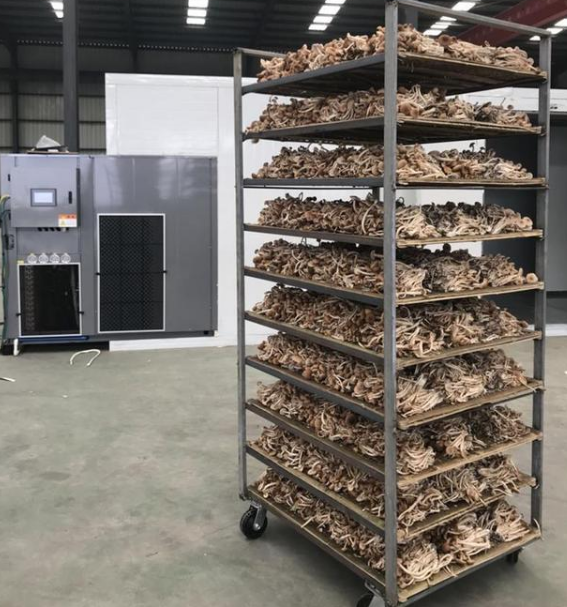 3.將裝好托盤的物料車推到干燥室中。干燥時,溫度要低,然后逐漸升高溫度。整個烘干階段的溫度應控制在35-65。前期需要在40以下的溫度下烘烤6個小時左右,在40-60的溫度下烘烤15-18小時,在60度的溫度下烘烤3~4小時。 鮮菇的水分含量越高,在低溫下烘烤所需的時間越長。